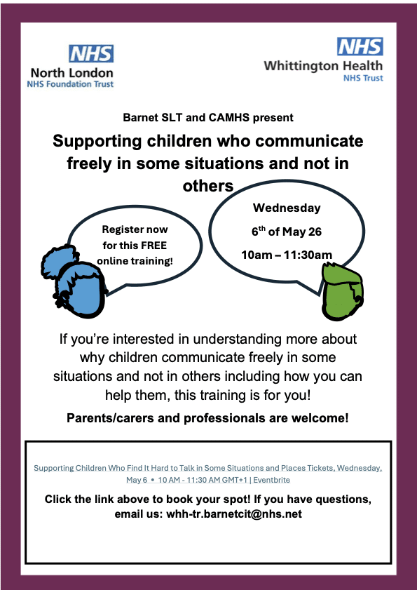 A free online training session on selective mutism being delivered on 6th May by CAMHS Under 5s and Barnet SLT jointly.